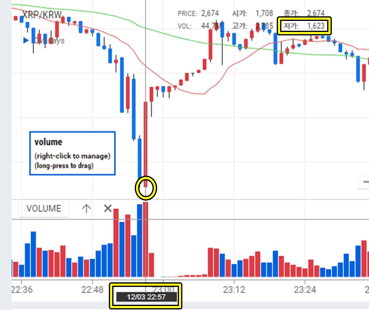 실제로 지난 3일 오후 10시 52분까지 3000원대를 유지하던 리플은 57분에 1623원까지 내려갔다.