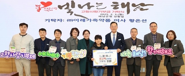 주인공은 ㈜이레가축약품 황은선 대표이사로, 지난 3일 해남군청을 찾아 해남군 고향사랑 기부제에 2,000만원을 기탁했다.