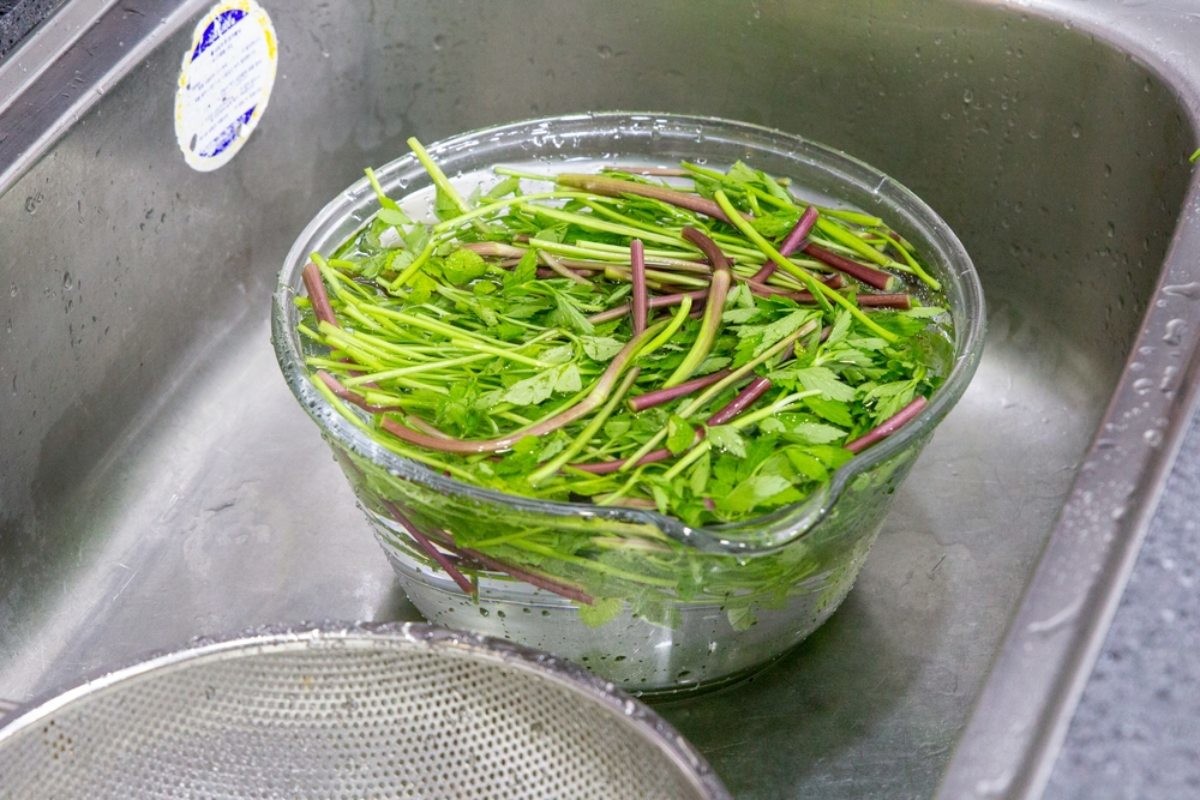 먼저 미나리를 흐르는 물에 한 번 헹궈 흙을 대략적으로 제거한 후, 식초를 푼 물에 10분 정도 담가 혹시 있을지 모르는 거머리와 세균을 제거한다.