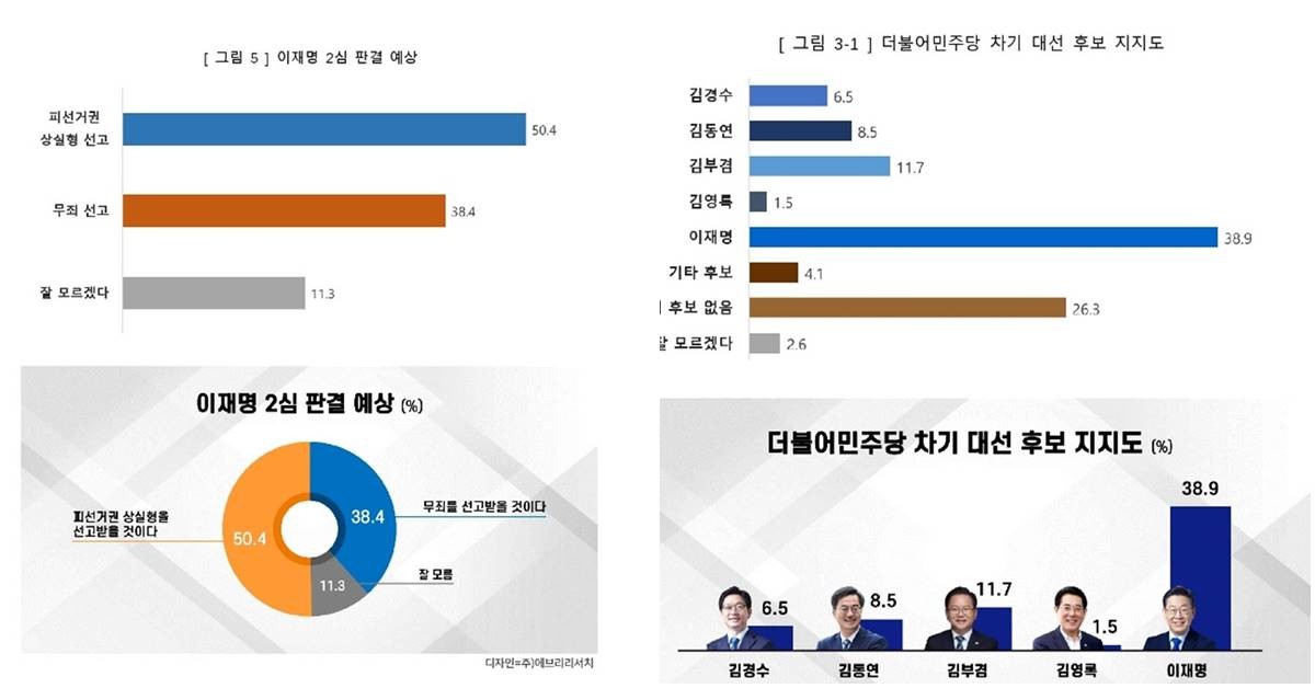 더불어민주당 차기 대선 후보 지지도는 이재명 38.9%, 김부겸 11.7% 순이었으나 이재명 대표의 2심 판결에서 피선거권을 상실할 것이란 전망이 50.4%로 무죄선고 38.4%보다 높았다.