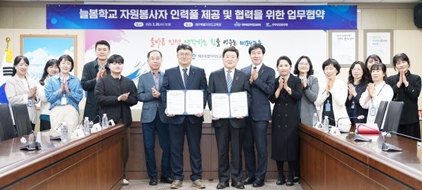 [위키트리 광주전남취재본부 노해섭 기자] 공무원연금공단(이사장 김동극) 제주지부는 26일 제주특별자치도교육청(이하 제주도교육청)에서 제주지역 늘봄학교에 퇴직공무원의 공직 경험과 재능을 활용한 자원봉사자 인력풀을 제공하기 위해 업무협약을 체결했다.