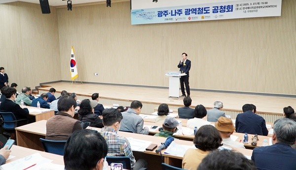 나주시(시장 윤병태)는 지난 27일 한국에너지공과대학교 1층 국제회의장에서 한국철도학회, 광주광역시, 전라남도와 공동으로 ‘광주 ~ 나주 광역철도사업 공청회’를 개최했다고 28일 밝혔다.