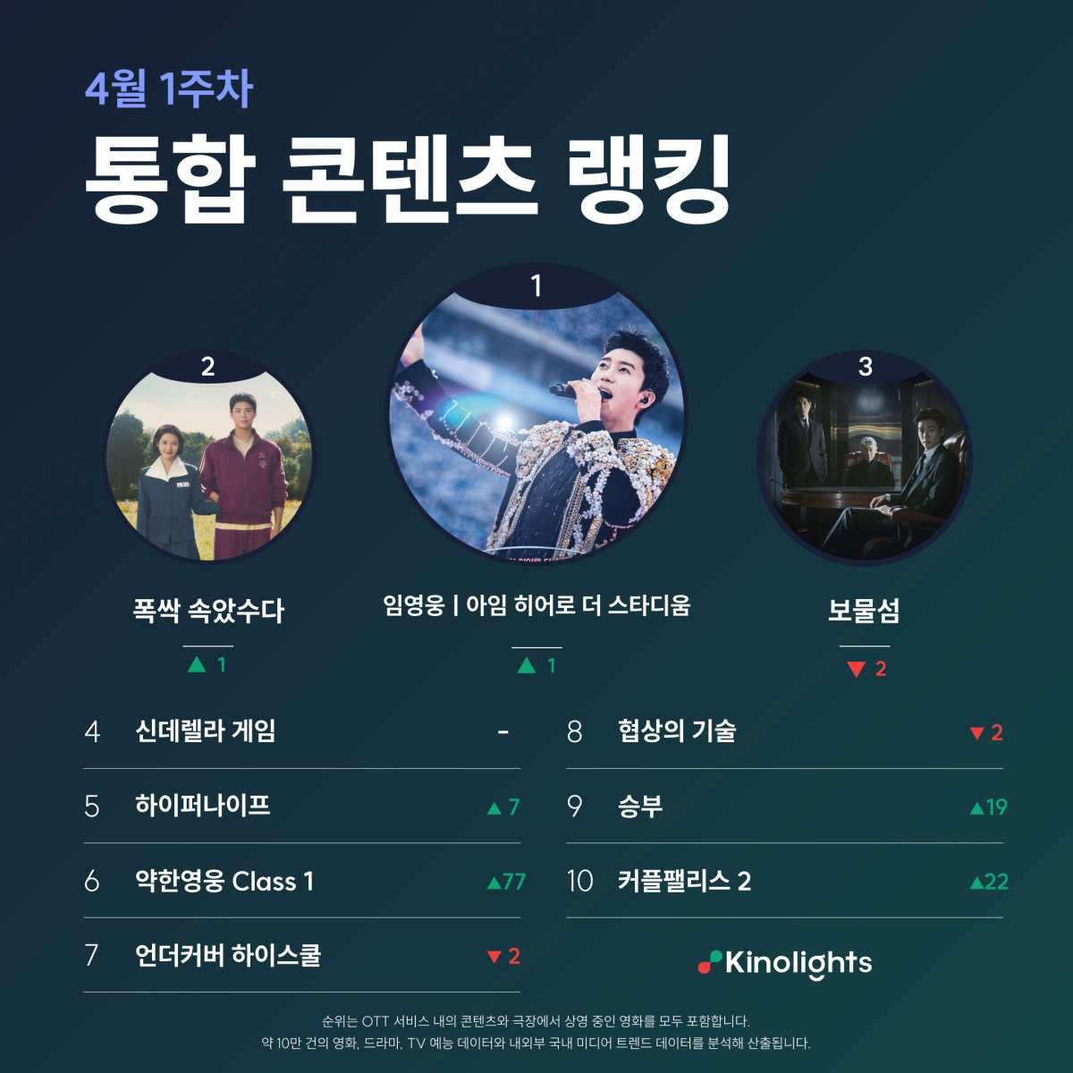 1일 키노라이츠가 공개한 4월 1주차(3/24~3/30) 통합 콘텐츠 랭킹에 따르면 '임영웅ㅣ아임 히어로 더 스타디움'은 공개 2주 만에 주간 콘텐츠 랭킹 정상을 되찾으며, 쟁쟁한 신작들을 모두 제쳤다. 넷플릭스 오리지널 시리즈 ‘폭싹 속았수다’, SBS 금토드라마 ‘보물섬’ 등의 강세 속에서도 굳건히 팬덤의 화력을 입증했다.