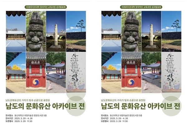 [위키트리 광주전남취재본부 노해섭 기자]동신대학교 미래라이프대학(학장 조준)이 28일까지 동신대학교 중앙도서관 5층 대정미술관에서 ‘남도의 문화유산 아카이브’ 전시를 개최한다.