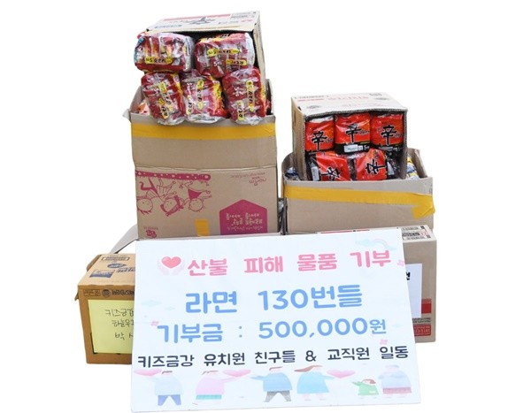 광주시 북구 삼각동에 위치한 키즈금강유치원(원장 이인숙)은 지난 3월 22일 발생한 초대형 산불로 엄청난 피해를 본 영남 지역민을 위해 어린이집 소속 원아·학부모·교원 등이 십시일반 모금한 성금 50만 원과 라면 700여 개를 기부했다고 24일 밝혔다.