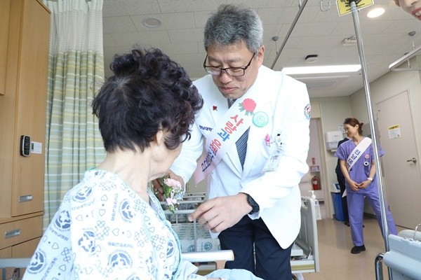 정 신 전남대병원장은 지난 8일 최명이 간호부장을 비롯한 병원 관계자들과 함께 보호자가 없는 간호간병통합병동인 8동 9층을 방문해 입원환자들에게 직접 카네이션을 달아드리고 쾌유를 기원했다. 전남대병원 본·분원의 간호부 주관으로 열린 이번 행사는 가정의 달이자 어버이날을 맞아 병원에 입원해 있는 70세 이상 환자 258명에게 아픈 마음을 위로해 주고, 감사와 존경의 마음을 전달했다.