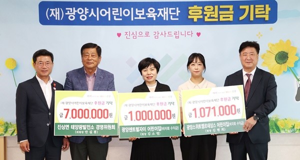 이날 함께 열린 일반 후원금 기탁식에서는 총 907만 1천 원의 기탁금이 전달됐다. 단체별로는 △진상면태양광발전소경영위원회(위원장 안길봉) 700만 원 △광양스위트엠르네상스어린이집(원장 김현희) 107만 1천 원 △광양센트럴자이어린이집(원장 김소영)에서 100만 원을 기탁했다.