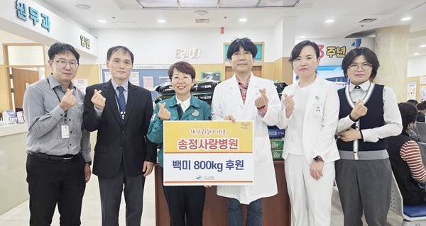 이어 송정사랑병원(원장 강명기)이 지난 13일 개원 23주년을 기념해 이웃과 따뜻한 정을 나누고 싶다며 백미 800㎏를 전달했다.