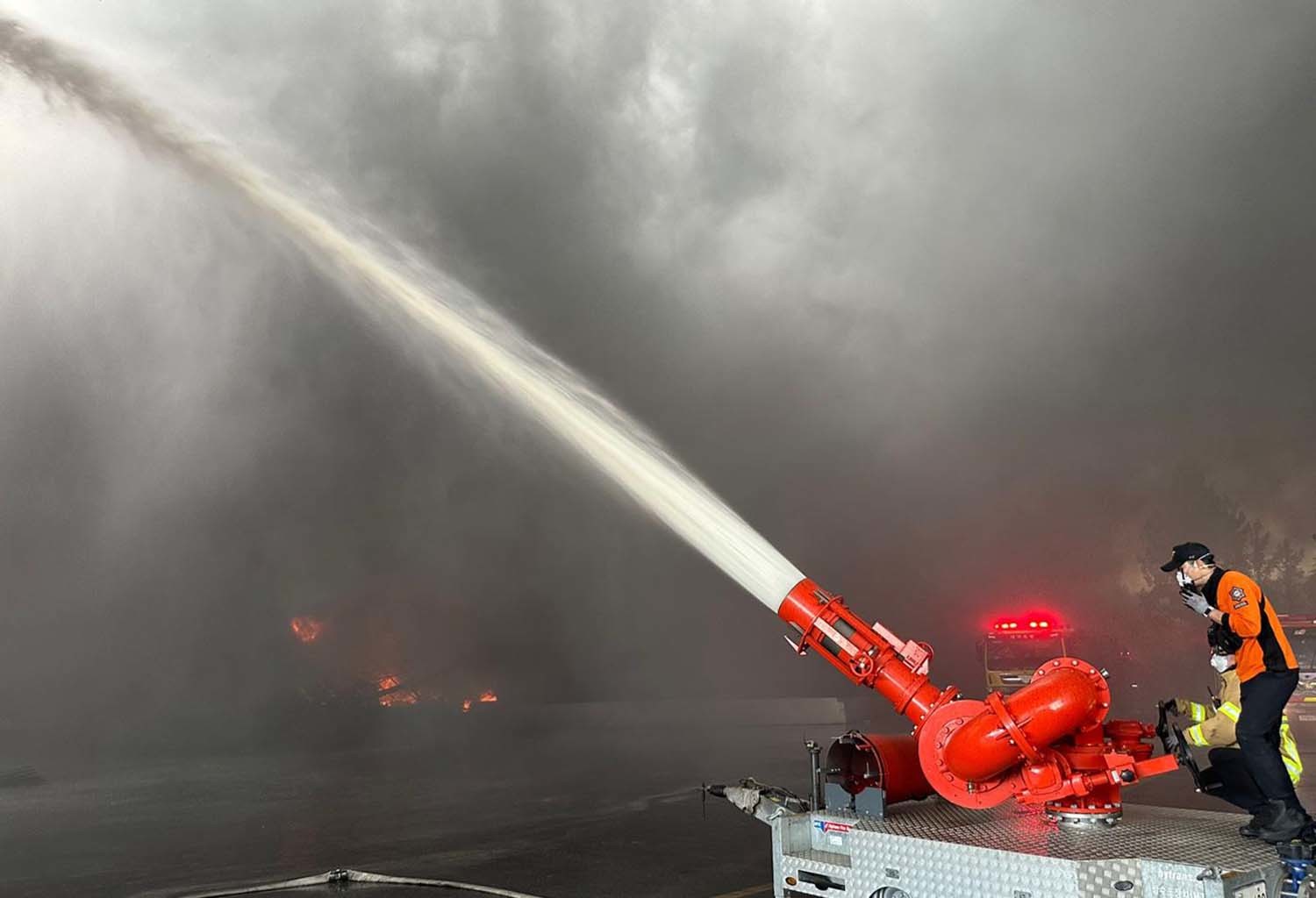 날이 저물자 당국은 투입한 헬기 11대를 모두 철수하고 4만 5000리터와 3만 2000리터의 물을 방사할 수 있는 대용량 방사포 2대 투입해 야간 진화 작업을 이어갔다. 당국은 완제품을 보관하는 1동으로 불이 번지는 것을 막아내면서 오후 9시 기준 진화율을 70~75%까지 끌어올렸다.