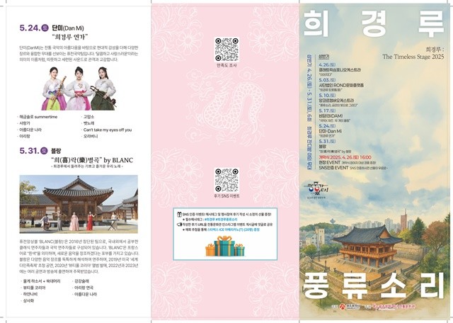 전통문화관 다음 공연은 5월 31일로, ‘토요 상설공연’은 무형유산 초청 무대 이순자 명인의 “5월의 향기, 춘향이 그네 뛰러 가는 날”과, ‘희경루 풍류소리’ 블랑의 “희(喜)락(樂)별곡” 무대를 선보일 예정이다.