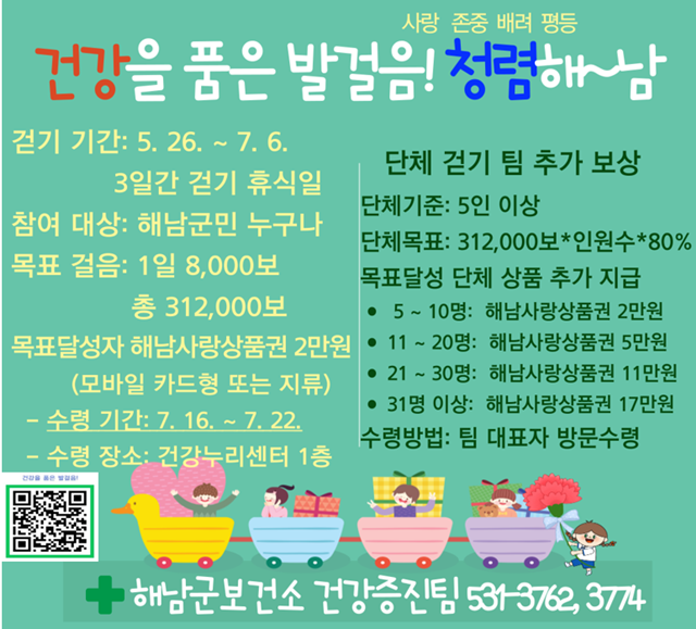 오는 7월 6일까지 이어지는 이번 걷기 챌린지는 군민 누구나 참여 가능하며, 하루 8,000보 이상, 총 31만 2,000보를 채우면 해남사랑상품권 2만 원이 지급된다. 참가자의 부담을 덜기 위해 목표 미달일 3일은 집계에서 제외된다.