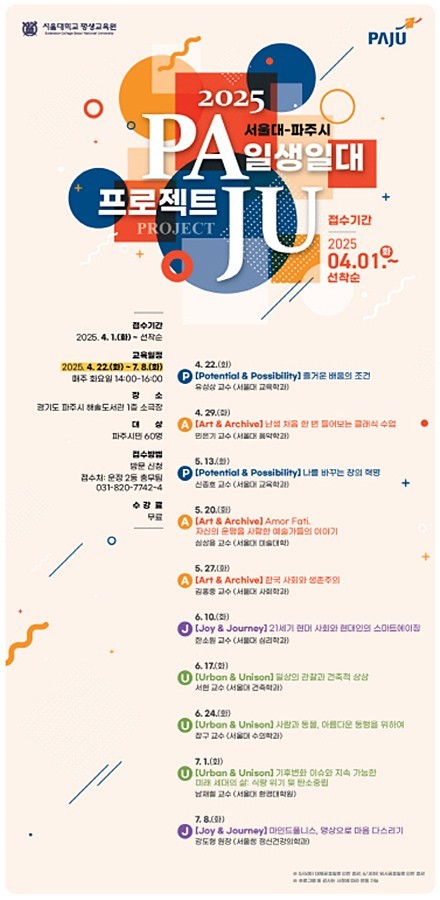지난 4월 22일 운정2동과 서울대학교 평생교육원이 파주(PAJU)를 주제로 일생일대 프로그램을 운영하고 있으며, 오는 9월에는 운정5동과 이화여자대학교 일생일대가 준비 중이다.