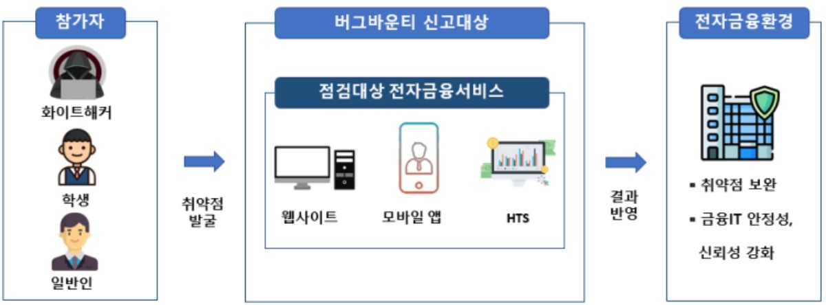 버그바운티는 금융회사가 운영 중인 서비스에 대해 자체적으로 발견하지 못하는 취약점을 외부에서 발견 및 조치하기 위해 실시하는 포상 제도다. 화이트 해커를 비롯해 학생과 일반인 등 정보보호에 관심이 있는 대한민국 국민이면 누구나 참가할 수 있으며 별도 참가비는 없다.
