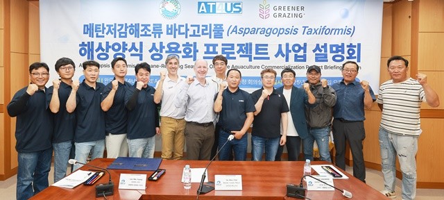 [위키트리 광주전남취재본부 노해섭 기자] 완도군은 지난 6월 5일 해양 블루테크 스타트업 AT4US Korea(대표 이민영, 구 레드씨위드랩스 코리아)와 글로벌 바다고리풀 연구 기업 Greener Grazing LLC(대표이사 Josh Goldman)와 토종 바다고리풀(Asparagopsis taxiformis)을 활용한 양식 산업 발전과 축산 메탄 저감 탄소 중립 실현을 위한 3자 간 업무 협약을 체결했다.