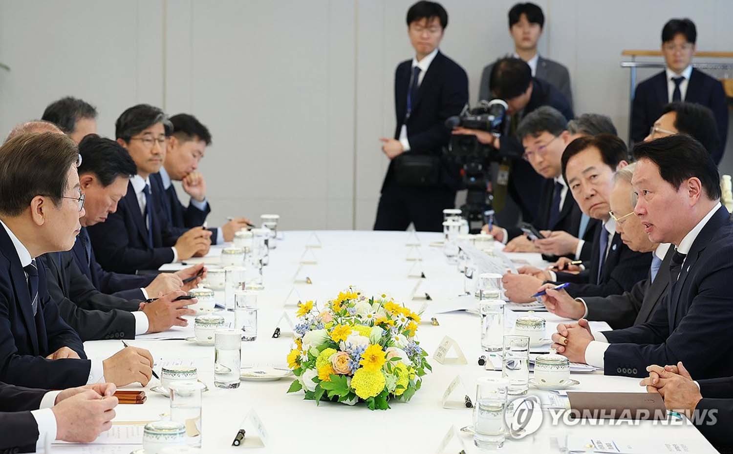 이재용 삼성전자 회장은 "재계와 소통하는 자리를 마련해줘 감사하다"며 "예정된 국내 투자와 고용을 차질 없이 진행해 어려운 경제 상황 극복에 최선을 다하겠다"고 말했다. 특히 이 회장은 "대통령 되시고 나서 대통령님 자서전을 읽어봤다. 청소년들 청년에게 꿈을 줘야겠다는 생각을 했다"고 하자 이 대통령은 "아 그러셨냐"고 화답하며 크게 웃었다.