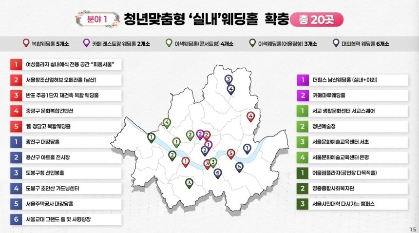 현재 서울시는 '북서울꿈의숲'과 '시립대 자작마루' 등 공공예식장 25곳을 운영 중인데 이번에 전망이 좋은 카페, 교통이 편리한 복합 웨딩홀 등 추가로 40곳을 조성하는 것이다.