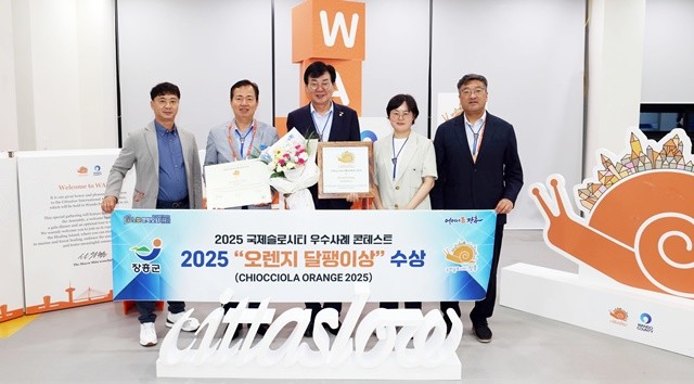 [위키트리 광주전남취재본부 노해섭 기자]장흥군이 21일 완도에서 열린 국제슬로시티 시장총회에서 최고 영예인 ‘오렌지달팽이상(Chicciola Orange 2025)’을 수상했다.
