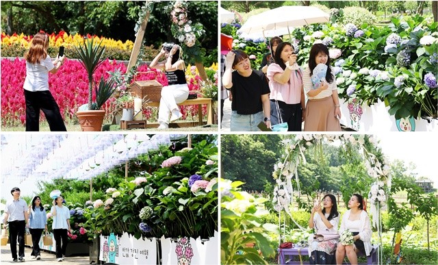 형형색색 만개한 수국길을 따라 걸으며 관광객들이 힐링의 시간을 보내고 있다. 축제는 29일까지 이어진다.