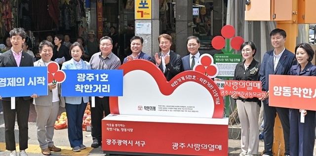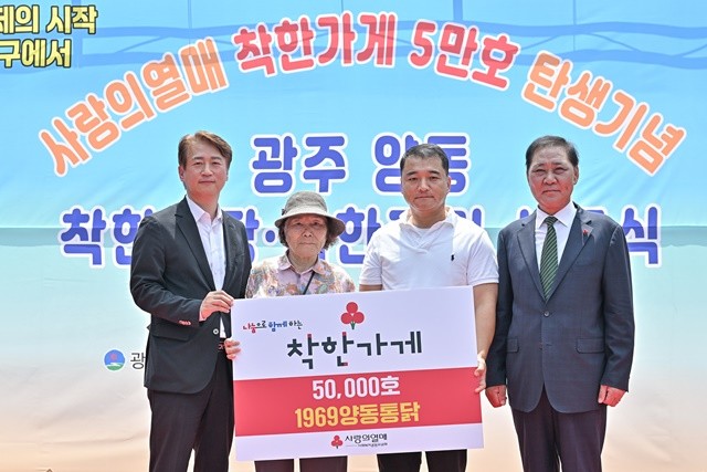 이날 행사에는 사회복지공동모금회 및 지역 상인들이 참석했으며, 양동의 명물 ‘1969양동통닭 본점’이 전국 5만번째 착한가게로 등록되어 의미를 더했다. 반드시 시장 입구에는 기념 조형물이 설립돼 시민·방문객들과 착한경제 메시지를 공유한다.김이강 광주 서구청장이 10일 서구 양동전통시장 일원에서 열린 '양동 착한시장·착한거리 선포식'에서 착한가게 5만호점에 가입한 '1969광주양동통닭' 대표 등과 기념촬영을 하고 있다. 광주 서구 제공