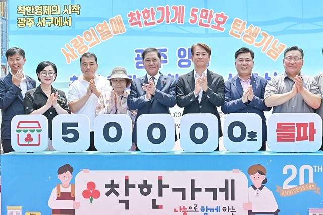 서구는 이날을 기념해 모바일 사용이 어려운 1,020명에게 양동시장 내 착한가게에서 사용할 수 있는 10만원 상당의 종이 ‘착한쿠폰’을 지급, 포용적 소비복지를 실천했다.김이강 광주 서구청장이 10일 서구 양동전통시장 일원에서 열린 '양동 착한시장·착한거리 선포식'에서 참석자들과 함께 착한가게 5만호 돌파 기념 퍼포먼스를 펼치고 있다. 광주 서구 제공