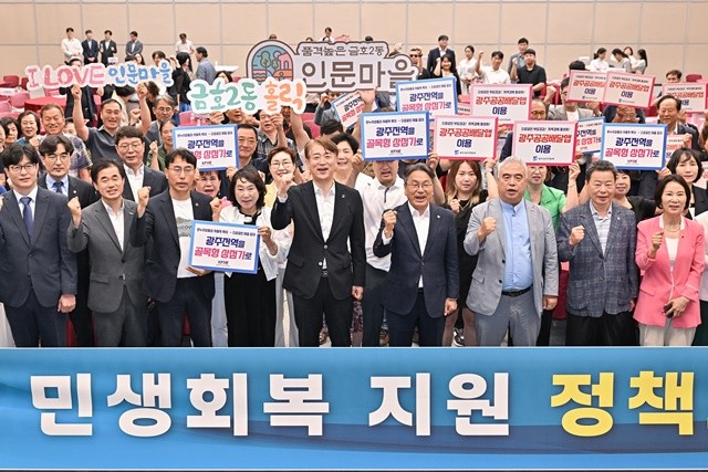 김이강 광주 서구청장이 23일 서구 김대중컨벤션센터에서 열린 ‘7+2 민생회복 지원 정책 보고회’에서 강기정 광주광역시장 등 참석자들과 기념촬영을 하고 있다. 광주 서구 제공