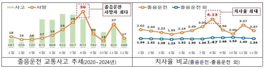 경찰청은 최근 5년간(2020~2024년) 졸음운전 교통사고를 분석한 결과 8월에 사망자가 가장 많았다고 30일 밝혔다. 같은 기간 전체 졸음운전 사고는 9559건으로 252명이 사망했으며 그중 8월에만 36명이 숨졌다. 이는 월별 기준으로 가장 많은 수치로 졸음운전 사고가 여름철 집중되는 경향이 있다는 점을 보여준다.