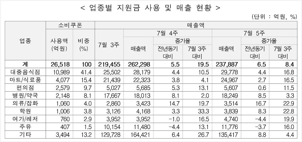 7월 5주(7월 28일~8월 3일) 매출액도 소비쿠폰 지급 전인 7월 3주 대비 8.4% 증가를 보였고, 전년 동기 대비로는 6.5% 상승했다.