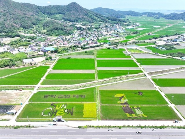 잘 자란 벼들은 순천시 슬로건, CI 로고, 흑두루미를 바라보는 가족 등 지역의 상징을 선명하게 그려낸다.