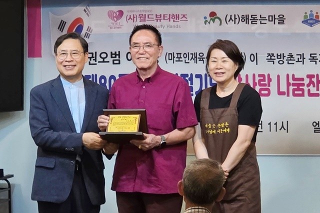 소셜서비스 NGO (사)월드뷰티핸즈(회장 최에스더, 신한대 교수)와 (사)해돋는마을(이사장 장헌일, 신생명나무교회 목사)은 13일 마포구 대흥동 엘드림노인대학에서 권오범 마포인재육성장학재단 이사장과 함께 ‘제80주년 광복절 기념 밥사랑 나눔 잔치 및 선물 전달식’을 개최했다.