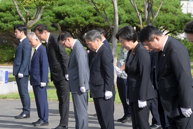 [위키트리 광주전남취재본부 노해섭 기자]강기정 광주광역시장이 15일 광복 80주년을 맞아 광주독립운동기념탑에서 참배하고 있다./광주광역시 제공.