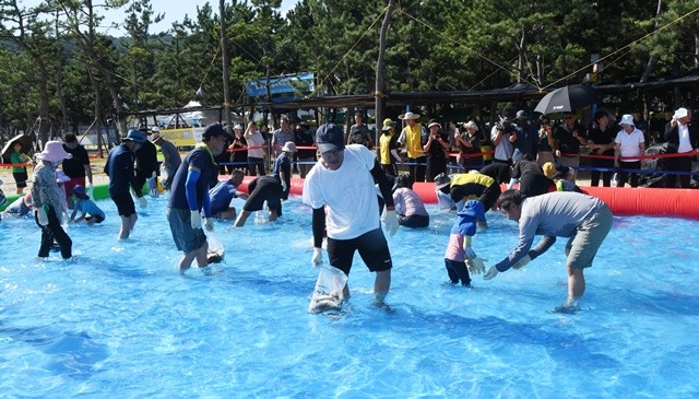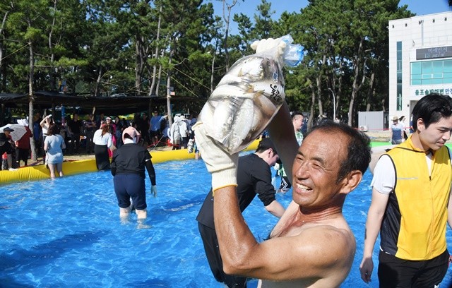해변에 마련된 대형 풀장에서는 ‘전어 잡기 체험’이 가장 큰 인기를 끌었다.