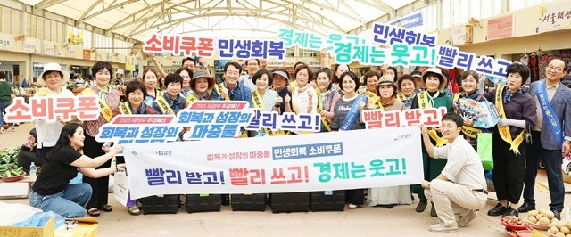 [위키트리 광주전남취재본부 노해섭 기자]강진군이 지역경제에 활기를 불어넣기 위해 9개 여성단체와 손잡고 ‘민생회복 소비쿠폰 빨리받고, 빨리쓰고, 경제는 웃고 캠페인’을 강진읍시장 일대에서 전개했다.