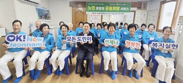 [위키트리 광주전남취재본부 노해섭 기자]전라남도(도지사 김영록)는 8일 순천 서면 대구1경로당을 방문해 지역 주민과 소통하고, 지역사회서비스 투자사업으로 운영 중인 ‘노인 맞춤형 운동처방 서비스’ 제공 현장을 살피며 참여 어르신들을 격려했다.