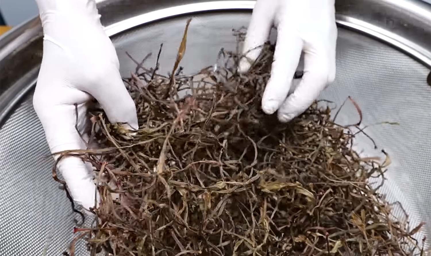 삶은 고구마줄기는 찬물에 씻지 않고 그대로 채에 받쳐 건조 과정으로 넘어간다. 햇빛에 세 시간 정도 말린 후 충분히 치대주는 것이 핵심 포인트다. 김 셰프는 이 과정에서 고구마줄기의 조직이 파괴되면서 부드러워진다고 설명했다. 치대기는 1분 정도면 충분하며, 이후 다시 2일간 바짝 말리면 완성된다.