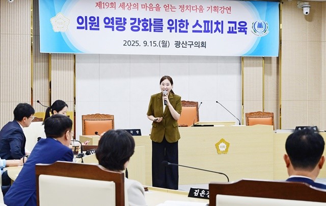 [위키트리 광주전남취재본부 노해섭 기자] 광주시 광산구의회(의장 김명수)는 15일 본회의장에서 의원 역량 강화를 위한 ‘정치다움 기획강연’ 스피치 교육을 진행했다. 이번 교육은 실질적인 스피치와 소통 능력 향상을 위해 마련됐다.