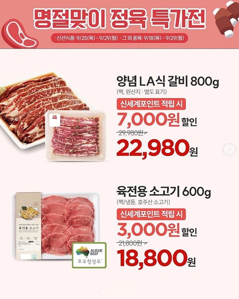 이마트에 따르면 목요일인 9월 25일부터 월요일인 9월 29일까지 '명절 맞이 정육 특가전'을 진행한다. 행사 기간 양념 LA갈비 1팩(800g)을 신세계포인트 적립 시 기존 2만 9980원에서 7000원 할인한 2만 2980원에 판매한다. 할인율은 약 23%다.