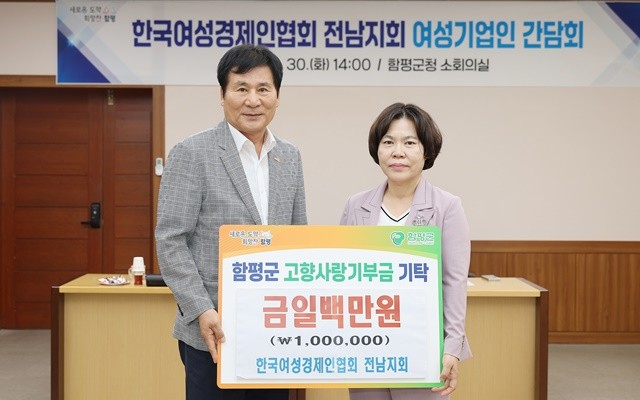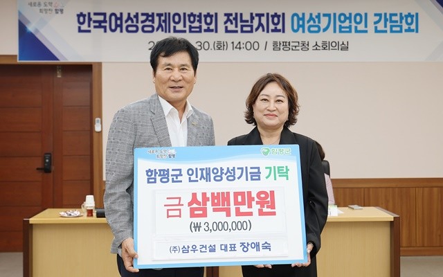이날 한국여성경제인협회 전남지회에서 고향사랑기부금 100만 원과 ㈜삼우건설에서 인재양성기금 300만 원이 함평군에 기탁되어, 상생 의지를 다시 한번 확인했다.