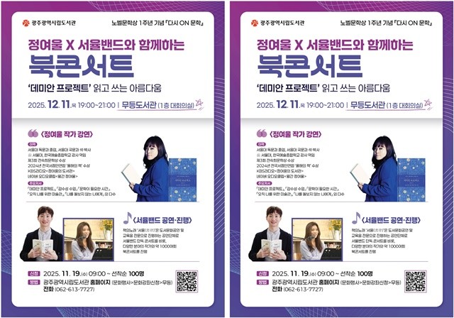 오는 11일 오후 7시 무등도서관 대회의실에서는 ‘다시 온(ON) 문학’을 주제로 북콘서트가 열린다. 정여울 작가의 책만남(북토크)과 서율밴드의 라이브 공연이 함께 진행되며, 한강 작가의 작품을 새롭게 해석하고 그 깊이를 함께 느껴보는 시간을 제공한다.