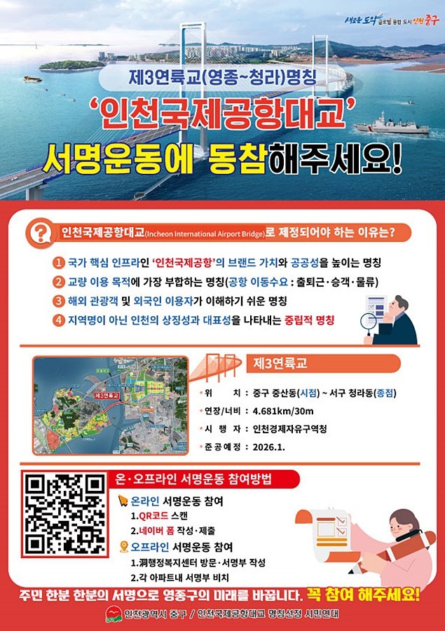 인천시 중구(구청장 김정헌)는 국토교통부 국가지명위원회 재심의에 앞서 제3연륙교 명칭을 ‘인천국제공항대교’로 제정하기 위한 주민 서명운동에 돌입했다고 10일 밝혔다.