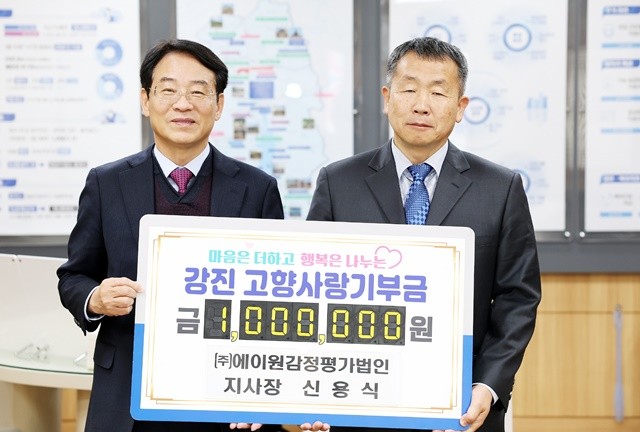 [위키트리 광주전남취재본부 노해섭 기자]강진군은 지난 11일 삼성전자 황인철 부사장이 고향사랑기부금 500만원, 신용식 ㈜에이원감정평가법인 지사장이 고향사랑기부금 100만원을 강진 응원의 마음을 담아 기탁했다고 12일 밝혔다.
