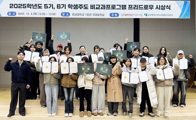 [위키트리 광주전남취재본부 노해섭 기자]호남대학교 비교과통합지원센터(센터장 좌현숙)는 12월 4일 낮 7호관 국제회의실에서 2025학년도 프리드로우 5·6기 학생주도 비교과프로그램 시상식을 갖고, 학생들이 스스로 기획하고 운영한 비교과 프로그램의 성과를 공유했다.