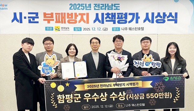 함평군은 지난 12일 열린 전라남도 주관 '2025년 부패방지 시책평가'에서 '우수상'을 수상했다고 14일 밝혔다. 이는 2023년 이후 2년 만의 우수기관 재진입으로, 그동안 청렴도 향상을 위해 절치부심하며 기울여 온 노력이 마침내 결실을 본 것이다.