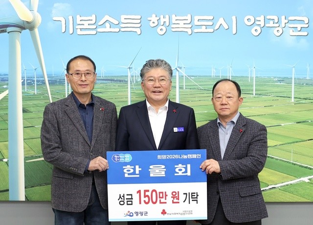 [위키트리 광주전남취재본부 노해섭 기자]영광군은 12월 12일 지역발전을 위해 활발히 활동하고 있는 1965년생 또래모임인 한울회(회장 박일수)에서 희망2026나눔캠페인 성금 150만 원을 기탁했다고 밝혔다.