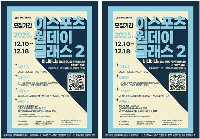 행사는 12월 20일 오후 2시부터 6시까지, 광주이스포츠교육원(광주 서구 상무대로 971, 3층)에서 대면 방식으로 진행된다. 참가비는 무료이며, e스포츠 산업·콘텐츠·크리에이터·프로씬에 관심 있는 시민 누구나 참여할 수 있다.