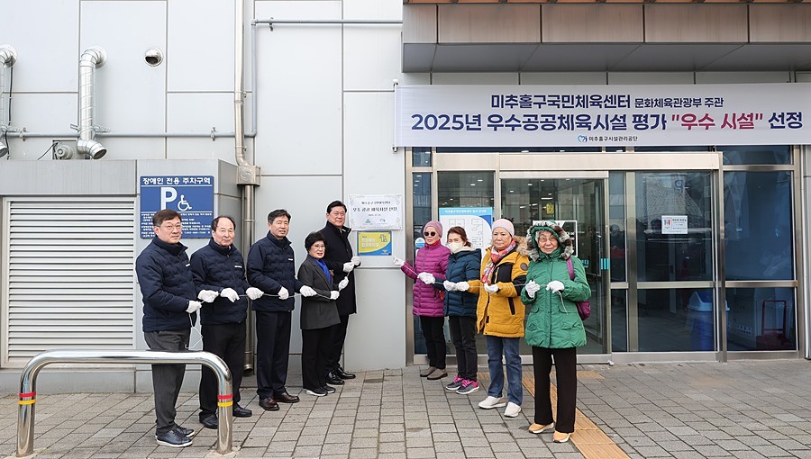 인천 미추홀구(구청장 이영훈) 시설관리공단(이사장 박종구, 이하 공단)은 지난 15일 미추홀구국민체육센터(이하 센터) 앞에서 ‘2025년 전국 우수 공공 체육시설’ 선정을 기념하는 현판 제막식을 성공적으로 개최했다.