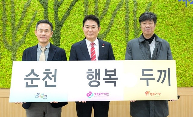 16일 순천시청에서 열린 ‘순천시 행복두끼 프로젝트’ 협약식에는 노관규 순천시장, 조민영 행복얼라이언스 본부장, 최준 행복도시락 사회적협동조합 사무국장이 참석해 협약을 진행했다.