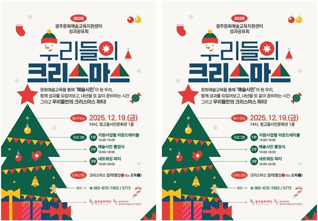 [위키트리 광주전남취재본부 노해섭 기자] 광주문화재단 광주문화예술교육지원센터는 오는 12월 19일 오후 4시, 빛고을시민문화관 1층에서 「2025 광주문화예술교육지원센터 성과공유회 ‘우리들의 크리스마스’」를 개최한다.