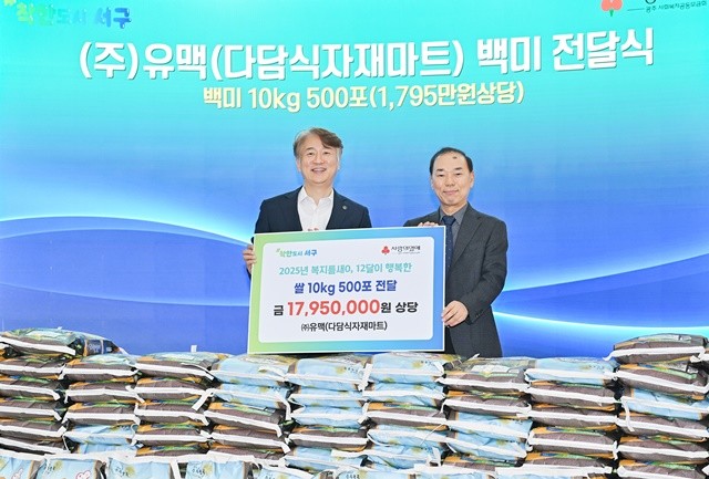 [위키트리 광주전남취재본부 노해섭 기자]광주시 서구(구청장 김이강)는 17일 서구청 1층 명예의 전당에서 ㈜유맥(다담식자재마트)(회장 임장택)로부터 돌봄이웃 지원을 위한 백미 10kg 500포 등 1795만원 상당의 후원품을 기탁 받았다. 광주 서구 제공