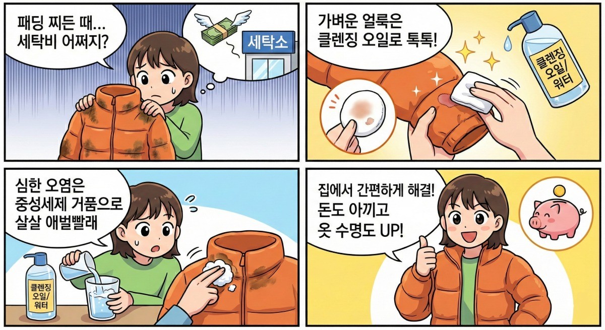 패딩은 잦은 전체 세탁보다 오염된 부분을 그때그때 관리하는 것이 옷의 수명을 늘리는 데 도움이 된다. 집에서 할 수 있는 간단한 얼룩 제거 방법을 활용해 세탁 비용 부담을 줄이면서도 비교적 깔끔한 상태를 유지해 보자.