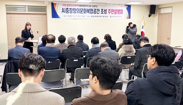 [위키트리 광주전남취재본부 노해섭 기자]광주시 동구는 17일 충장동 행정복지센터 회의실에서 주민, 구의회 의원, 상인회 등 관계자 50여 명이 참석한 가운데 'AI 충장창의문화복합공간(가칭) 주민설명회'를 개최했다.